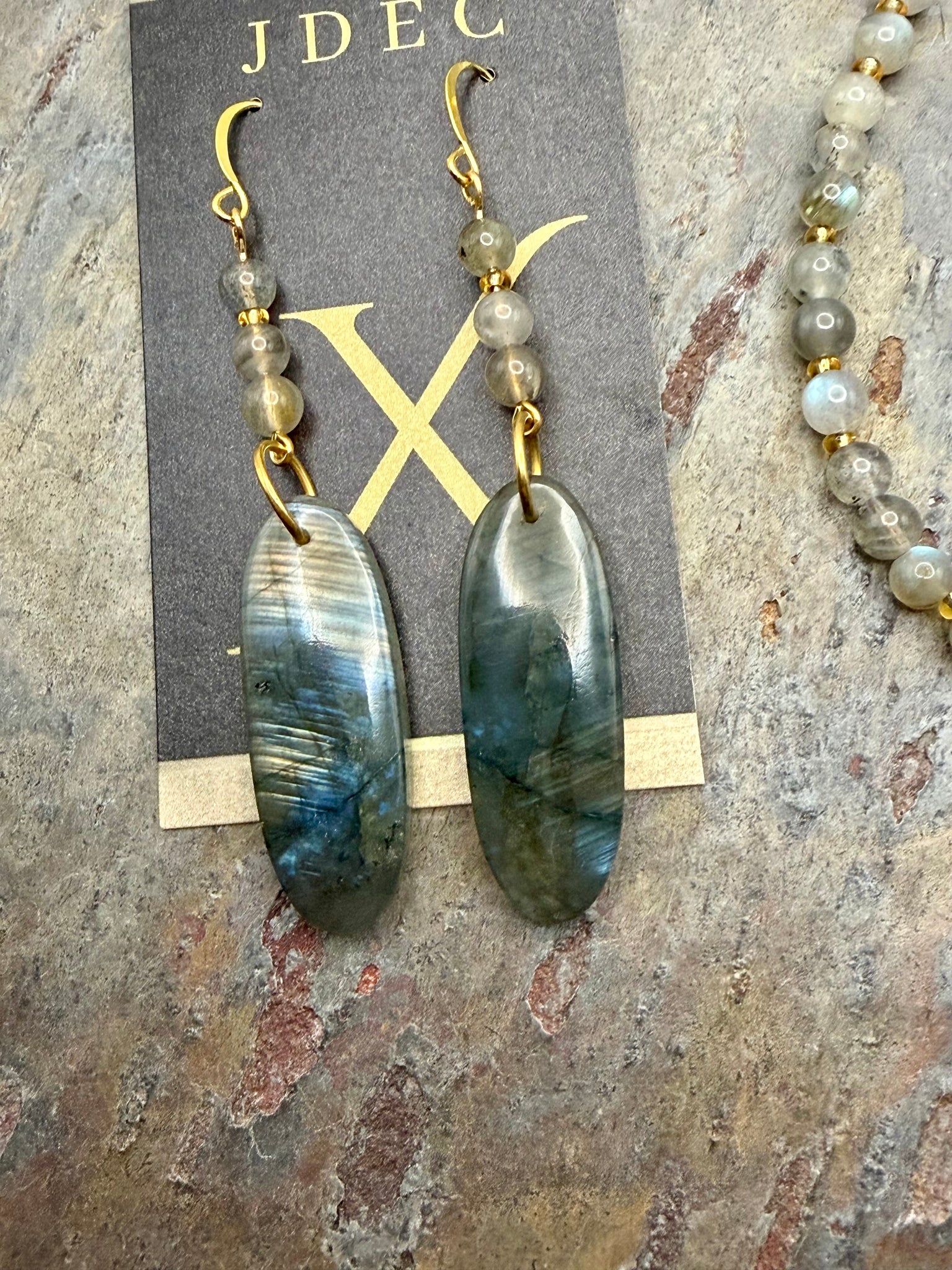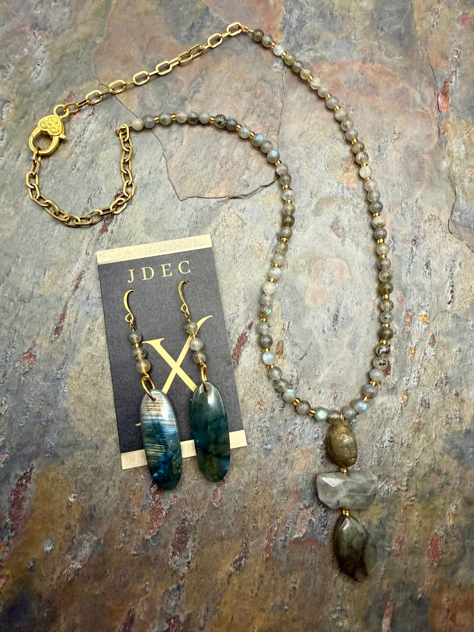 This is definitely a Labradorite lovers dream set! I handmade the pendant with various sizes and shapes of Labradorite stones and each of them has its own personality. And can we just stop and appreciate the pendant charms on those earrings?! So flashy and jaw dropping!