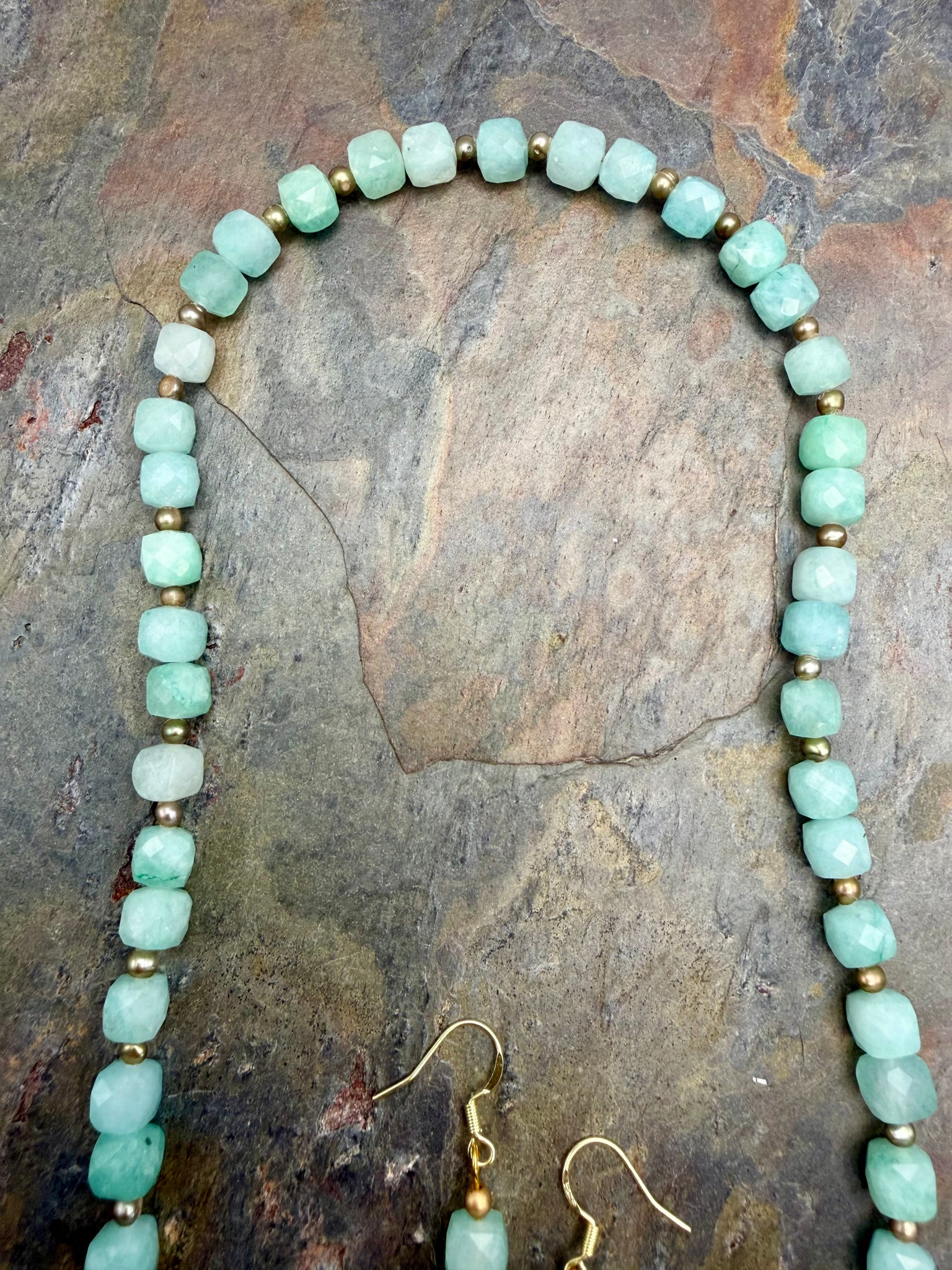 Multi Pendant Necklace and Earring Jewelry Set featuring Cubed Amazonite Beads