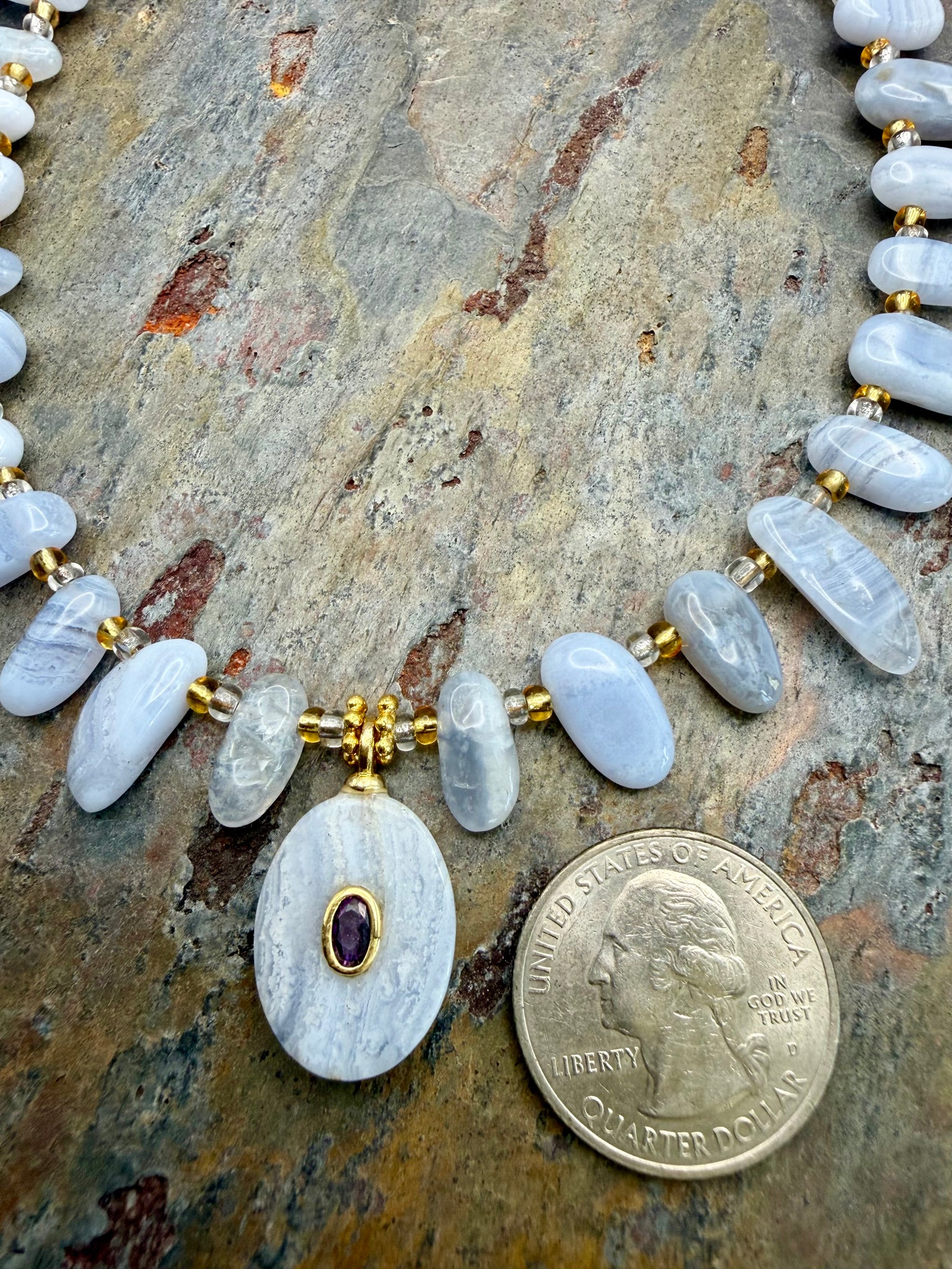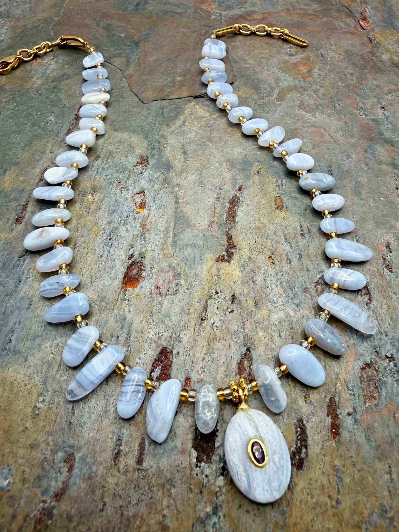 Blue Lace Agate stone pendant with rhinestone accents.
